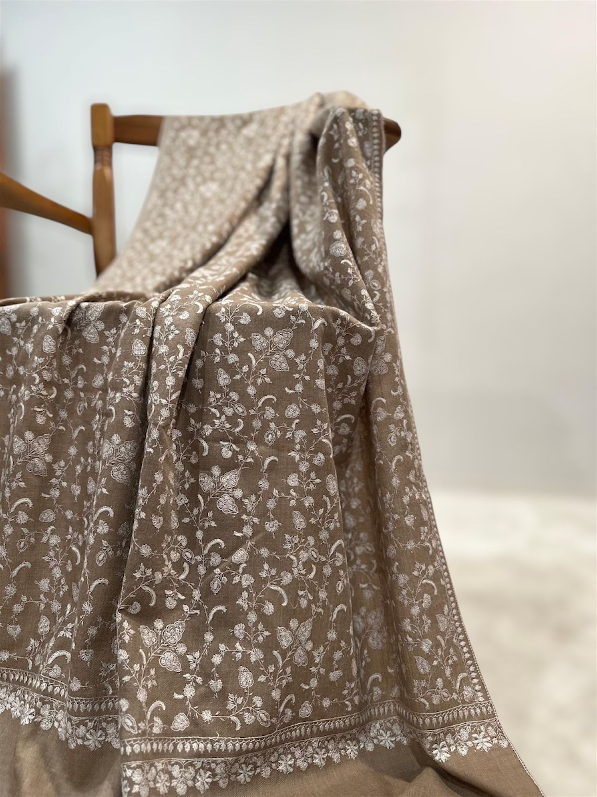 An authentically handcrafted Pashmina imparts the sensation of enveloping oneself in the purest, billowy clouds. Its gentle caress, soft texture, and exceptional warmth cradle you in comfort. Pashmina possesses a subtly lustrous sheen attributed to its intricate twill tapestry weaving, which captures and reflects delicate hints of light, bestowing upon it an opulent allure. When a handcrafted Pashmina shawl undergoes the artistry of Kashmiri embroideries, it not only looks but also exudes an even more majestic and regal presence.